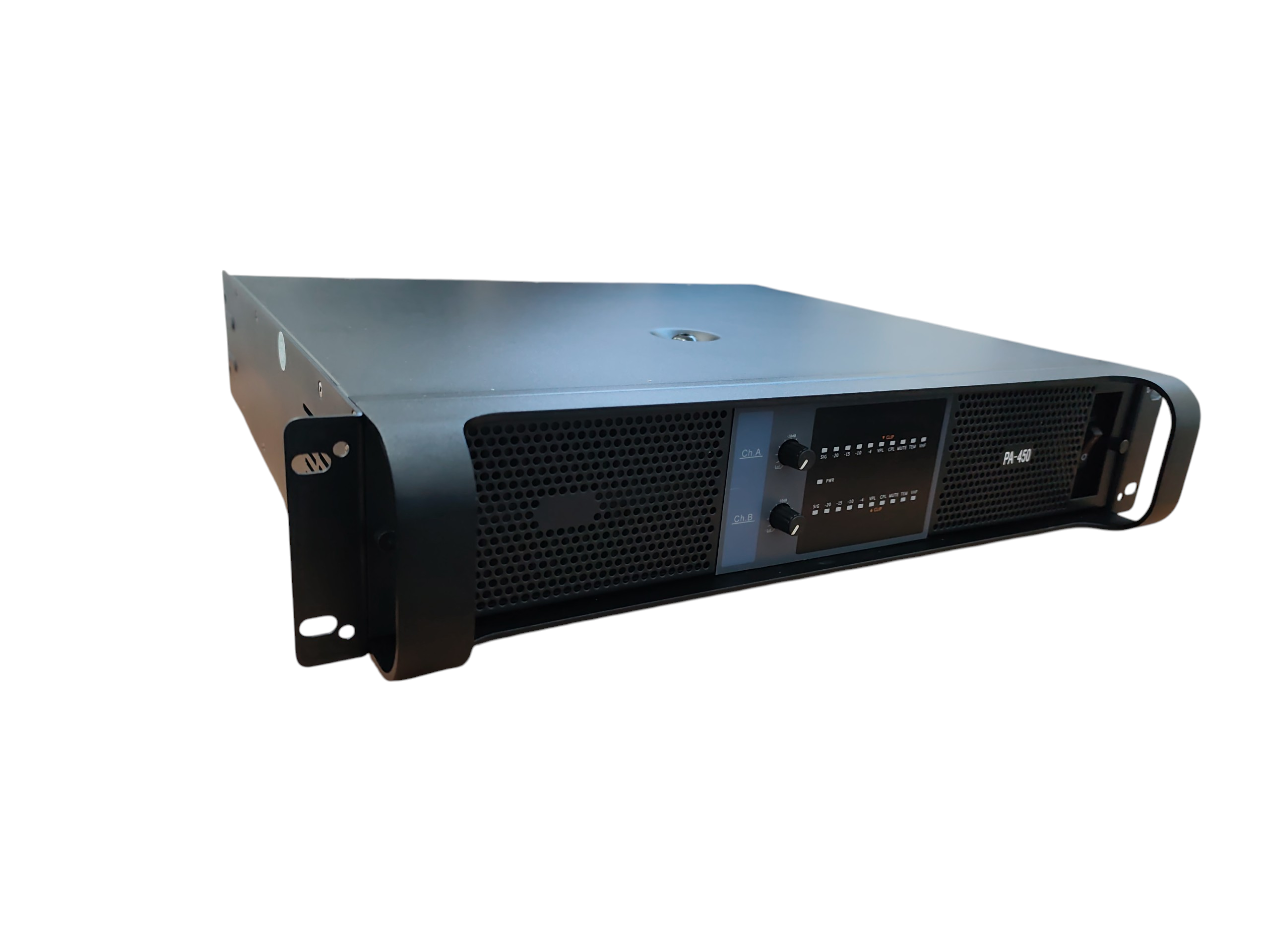 Il dispositivo lavora su 2 canali con potenza di 450W per canale a 8 Ohm, offrendo prestazioni adatte alla gestione di sistemi audio professionali dove sono richiesti controllo, efficienza e qualità di amplificazione. Il pannello frontale presenta comandi dedicati per i due canali e indicatori LED per un monitoraggio immediato dello stato operativo.