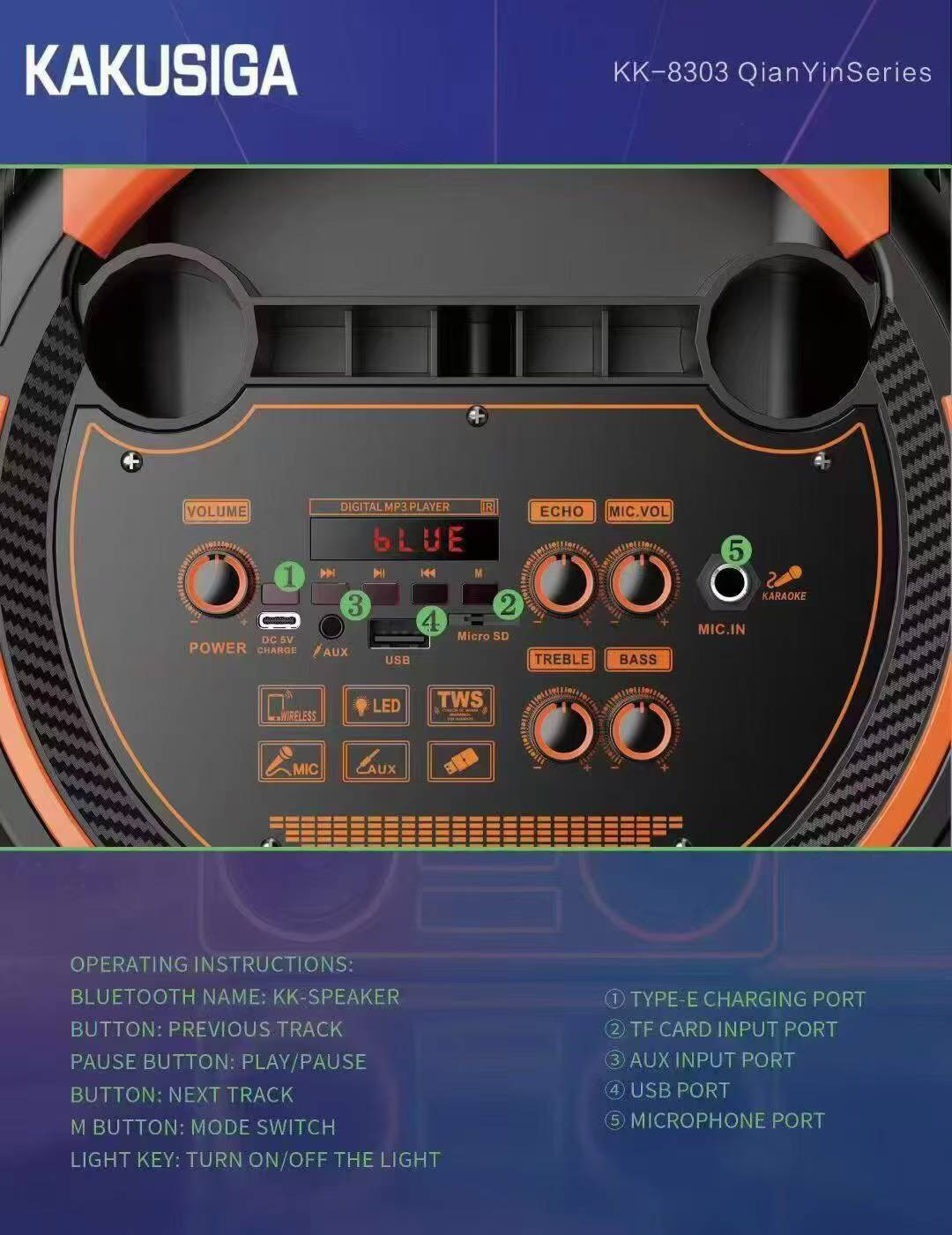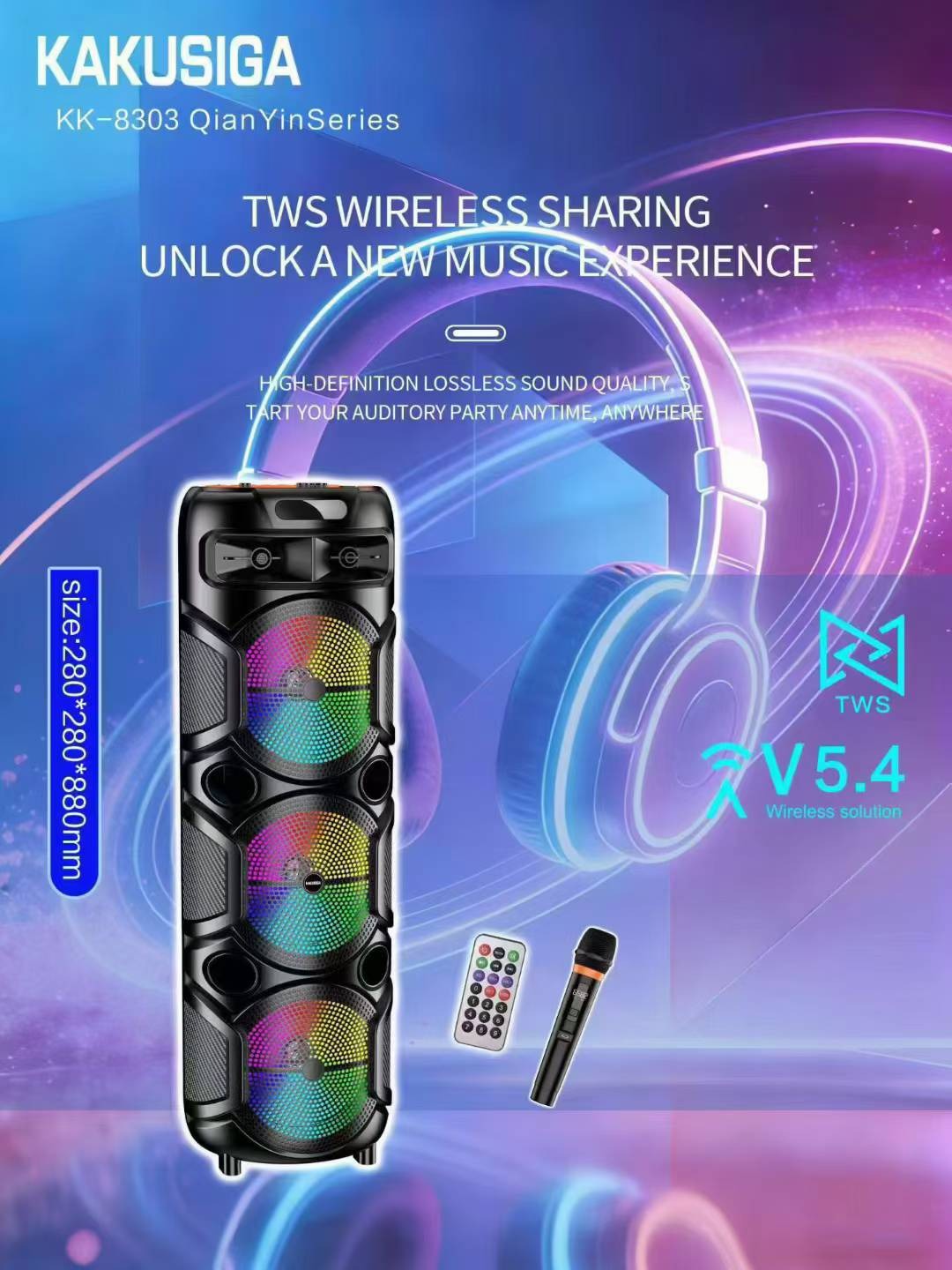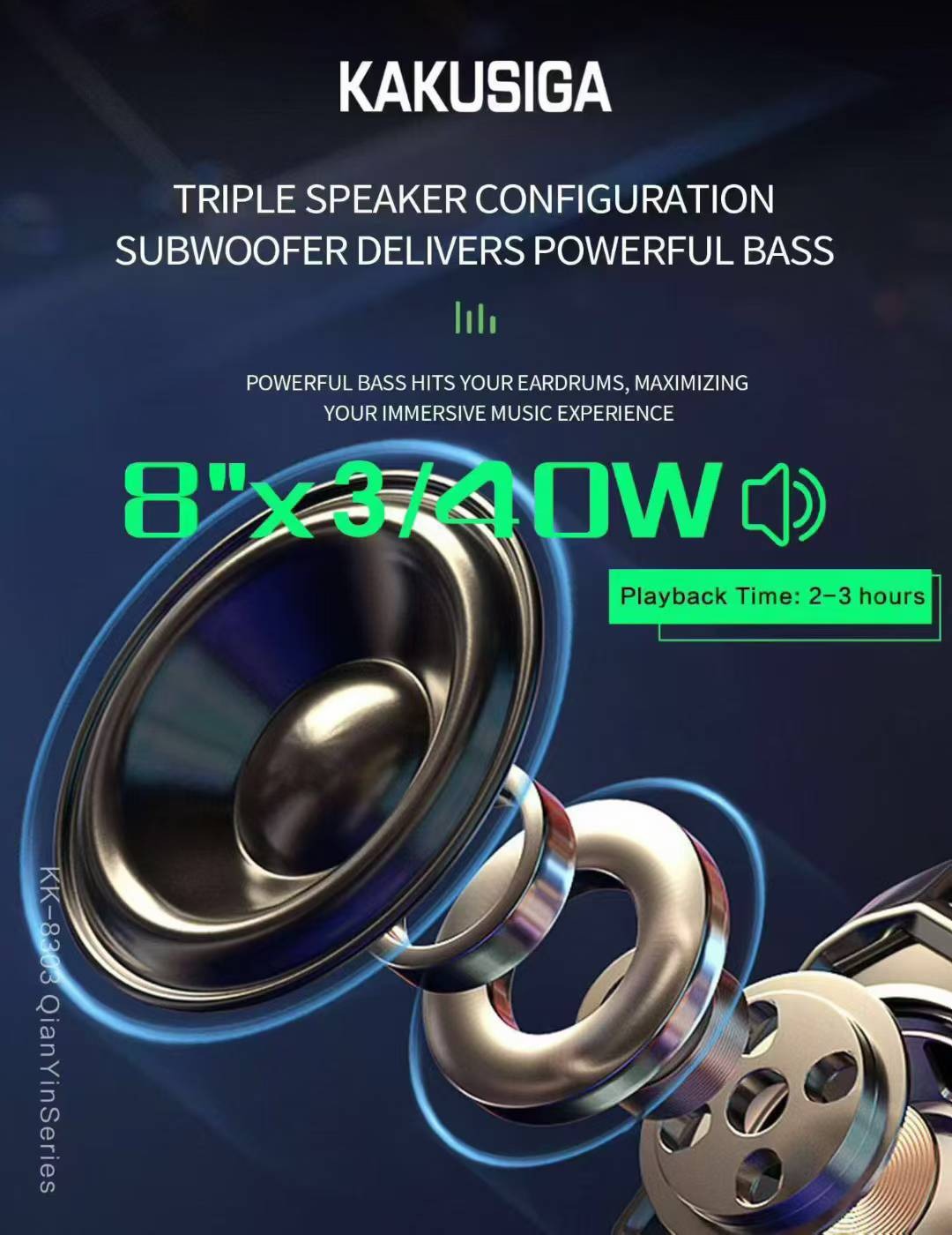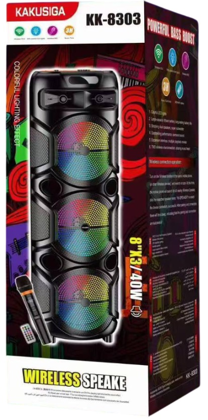 Speaker wireless portatile dal design scenografico e di forte impatto visivo, ideale per musica, karaoke, feste, eventi e momenti di intrattenimento sia in casa sia in ambienti esterni. Questo diffusore è progettato per offrire un suono potente e coinvolgente grazie alla configurazione con tre altoparlanti da 8 pollici e tweeter dedicato, accompagnati da effetti luminosi LED multicolore che rendono ogni utilizzo ancora più dinamico.