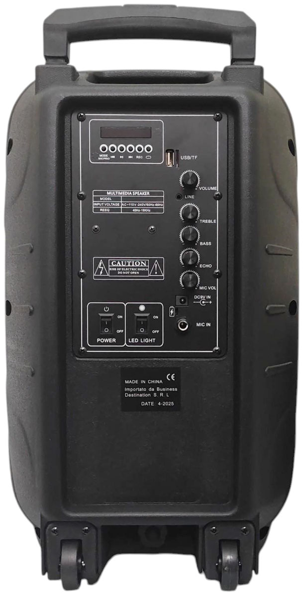 La potenza nominale è di 40W, adatta per un ascolto chiaro e deciso. Il sistema integra un modulo multimediale con display, comandi frontali dedicati e porta USB/TF per la riproduzione dei contenuti compatibili. Sono presenti inoltre ingresso LINE e ingresso MIC IN, che rendono la cassa adatta anche a collegamenti esterni e utilizzo con microfono.