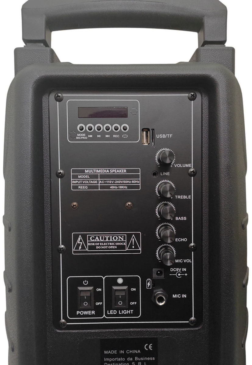 Sul pannello di controllo sono disponibili regolazioni separate per Volume, Treble, Bass, Echo e Mic Volume, così da permettere una personalizzazione del suono in base all’ambiente e al tipo di utilizzo. È presente anche un interruttore dedicato per la luce LED, oltre al classico interruttore di accensione.