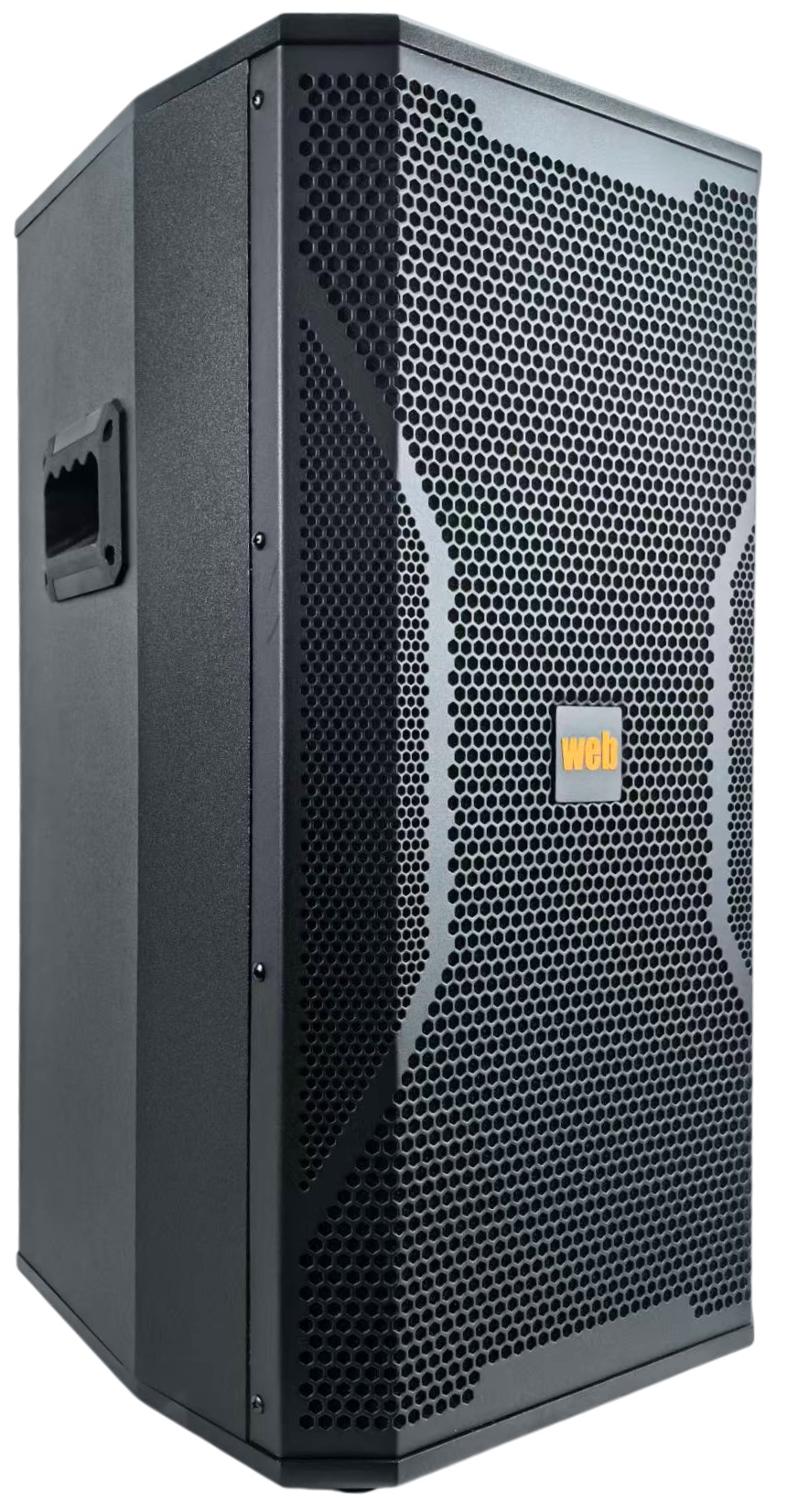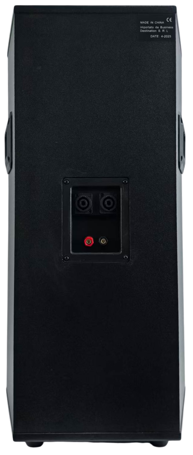 Il cabinet è realizzato in materiale robusto e resistente, con griglia metallica frontale di protezione degli altoparlanti. Le maniglie laterali integrate facilitano il trasporto e il posizionamento. Il design è pensato per un utilizzo intensivo e professionale.