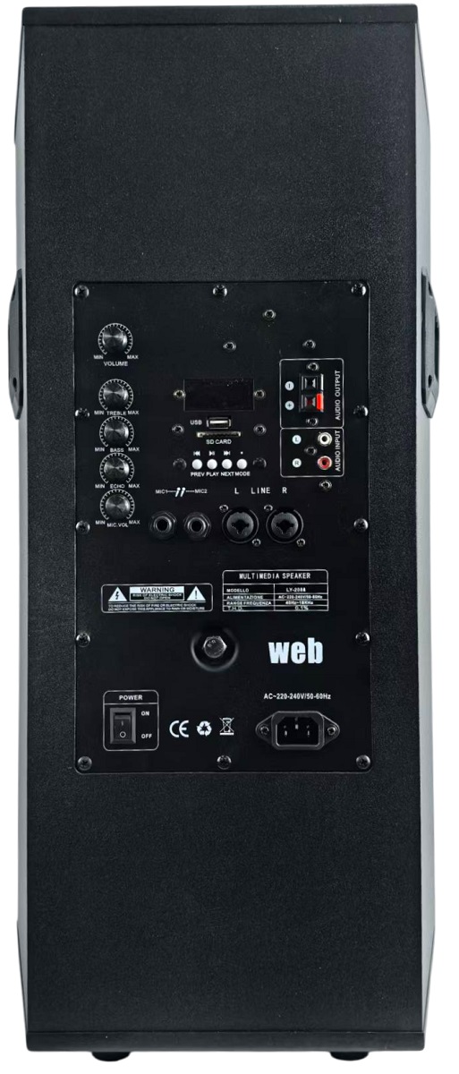 Il pannello di controllo posteriore integra un vero e proprio mixer compatto che consente la gestione diretta di più sorgenti audio, microfoni e contenuti multimediali, senza necessità di apparecchiature esterne aggiuntive.