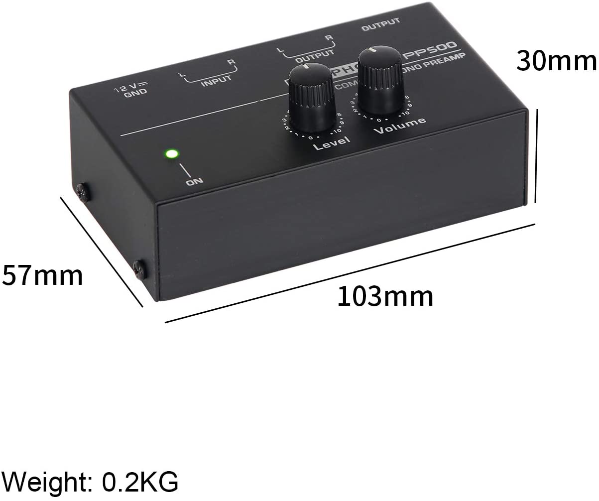 - Preamplificatore phono ultracompatto con guscio metallico, portatile e resistente.