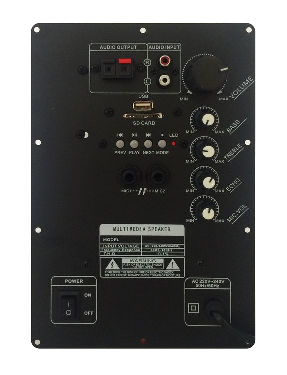 Controlli: Volume generale, Bassi, Alti, Eco, Volume microfono