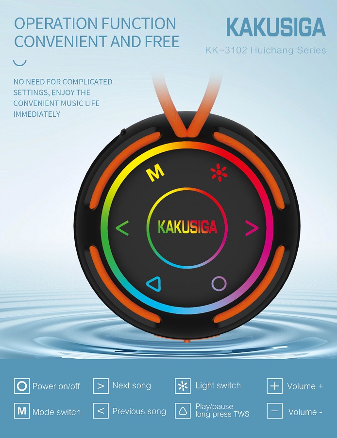 L’altoparlante wireless KAKUSIGA KK-3102 è una soluzione compatta e portatile progettata per offrire un’esperienza audio immersiva in qualsiasi contesto, sia indoor che outdoor. Grazie al design moderno con illuminazione LED multicolore e alla certificazione IPX6, combina estetica, resistenza e prestazioni sonore in un unico dispositivo.