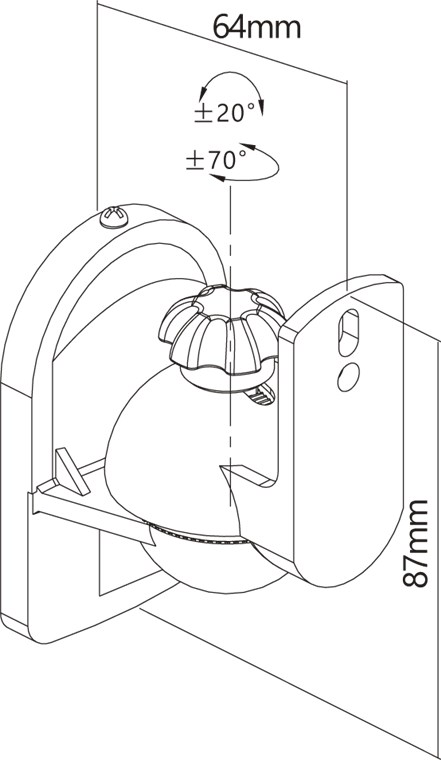 L'attacco a parete ideale per diffusori satellite del peso di max. 3,5 kg, che è montato sul filo singolo o un doppio filo del diffusore. Si tratta di una soluzione semplice e veloce installazione con il plug-in esecuzione a piastra a muro. struttura di regolazione arcuata permette un'inclinazione di 20 ° su e giù e 70 ° a sinistra oa destra. In questo modo le condizioni di suono ideale. La manopola di regolazione fornisce un semplice, senza attrezzi modo per allineare il diffusore così da ottenere le condizioni suono desiderato. Il supporto ha una distanza dalla parete 64 mm