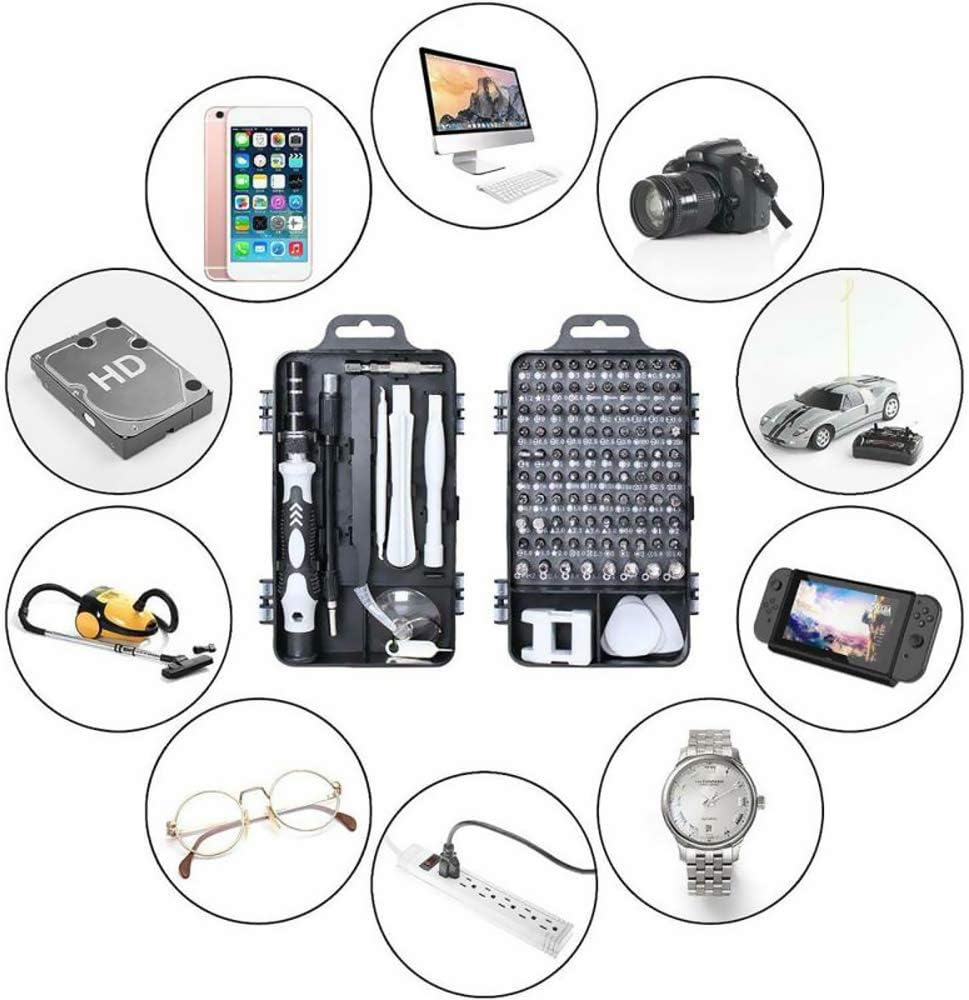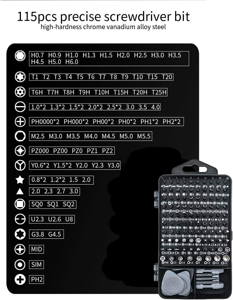 Il kit cacciavite di precisione da 115 pezzi è un set completo progettato per interventi di smontaggio, manutenzione e riparazione su dispositivi elettronici e meccanismi di piccole dimensioni. Ideale per tecnici, laboratori, centri assistenza e appassionati di elettronica, consente di operare con la massima precisione su smartphone, tablet, notebook, fotocamere, orologi, console, hard disk e dispositivi di precisione.