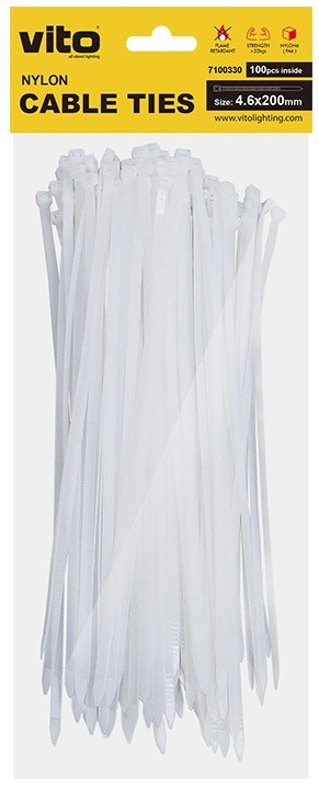 FASCETTE PER CAVI VITO PLASTICK realizzate in NYLON6 (PA6) di colore BIANCO con protezione UV e test di tensione di 22 kg. Le dimensioni di una fascetta sono 4.6X200 mm. Facile installazione manuale.