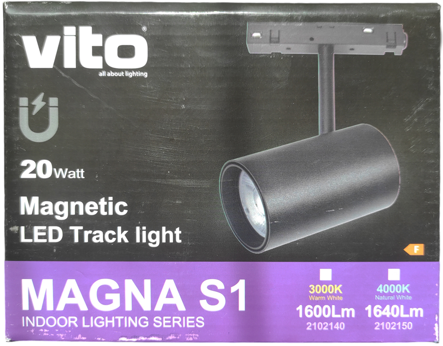 ILLUMINAZIONE A BINARIO serie MAGNA con corpo in alluminio, prestazioni di illuminazione pari a 1640 Lm e una lunga durata di 25000 ore. Questo modello da 20 W include LED da 4000 K (BIANCO NATURALE) con un angolo di illuminazione di 24°.