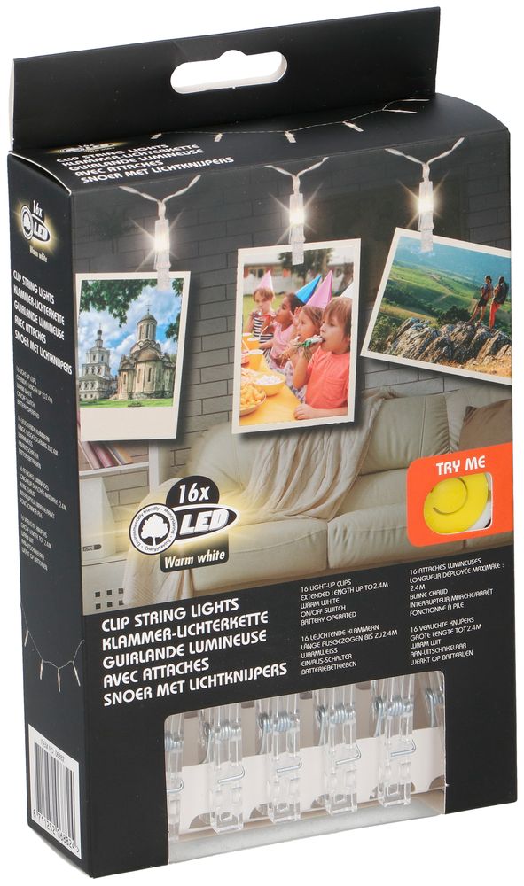 Crea una meravigliosa atmosfera e valorizza le tue foto con questa fantastica catena luminosa. Questa catena luminosa a batteria è dotata di 16 luci a led con molletta che ti permette di appendere le tue fotografie preferite in modo da creare un complemento d'arredo particolare e di grande effetto.