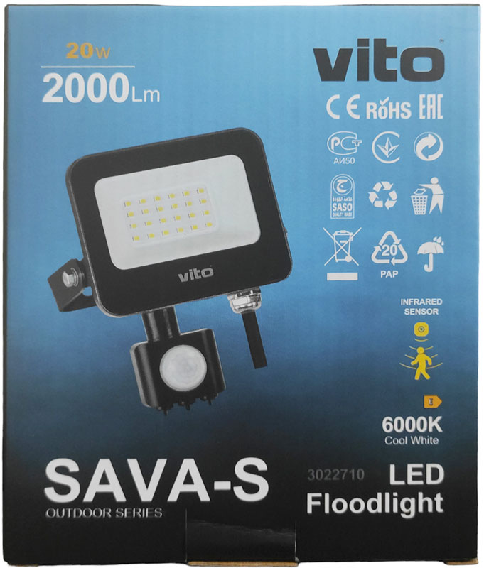 SAVA S prima generazione, è una famiglia economica di proiettori impermeabili, IP65, dotati di LED SMD e sensore PIR.