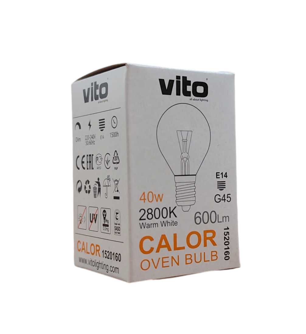 La lampadina per forno Vito Calor 40W è una soluzione affidabile per l’illuminazione interna di forni ed elettrodomestici compatibili che richiedono una sorgente luminosa con attacco E14. Il vetro trasparente e la luce bianco caldo da 2800K assicurano una buona visibilità dell’interno, contribuendo a controllare in modo pratico e immediato la cottura o il funzionamento dell’apparecchio. La forma G45 la rende adatta a installazioni dove sono richieste dimensioni compatte e una diffusione luminosa ampia.