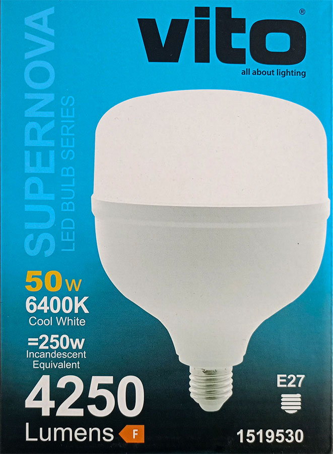 Questa lampada da 50 W include un LED da 6400 K (luce fredda) e un attacco E27 con un angolo di illuminazione di 270°.