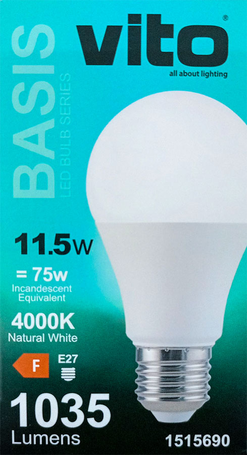Questa lampada da 11,5 W include LED da 4000 K (luce naturale) e attacco E27 con un angolo di illuminazione di 270°.
