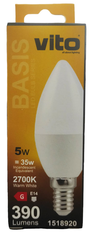 Le LAMPADINE LED della serie BASIS con corpo in plastica e alluminio e diffusore in policarbonato offrono una potenza di illuminazione di 390 Lm e una lunga durata di 15000 ore. Questo modello da 5 W include LED da 2700 K (BIANCO CALDO) e attacco E14 con un angolo di illuminazione di 180°.