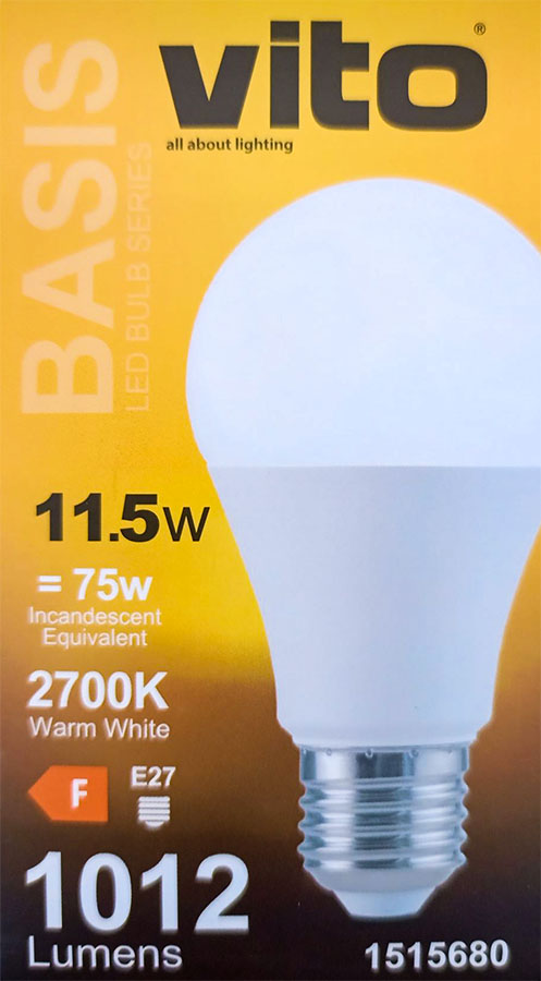 Questa lampadona da 11,5W include un LED da 2700K (luce calda) e un attacco E27 con un angolo di illuminazione di 270°.
