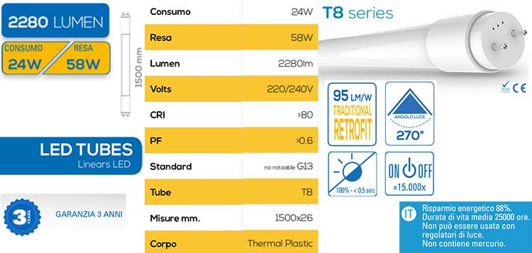 Tubo LED T8 G13 24W 150cm - Luce fredda
