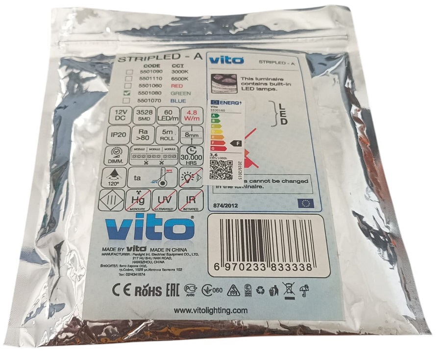 Striscia LED verde Vito 5501080 con 60 diodi per metro lineare tipo SMD3528 e potenza 4,8 W/m. La striscia LED funziona a 12 V CC ed è venduta in un rotolo da 5 m, senza alimentatore o controller inclusi nel set. La striscia LED è dotata di un nastro autoadesivo, che ne facilita l'installazione. È adatta per l'installazione in profili di alluminio su pareti o soffitti e per la realizzazione di illuminazione decorativa, e può anche fungere da retroilluminazione universale ove necessario. Il grado di protezione è IP20, quindi non è adatta all'uso in ambienti umidi.