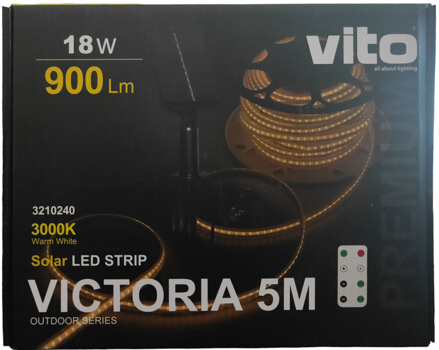 VICTORIA, è un set di strisce led solari impermeabili, IP65, con telecomando. Custodia in ABS di colore nero. Pannello solare in policarbonato.