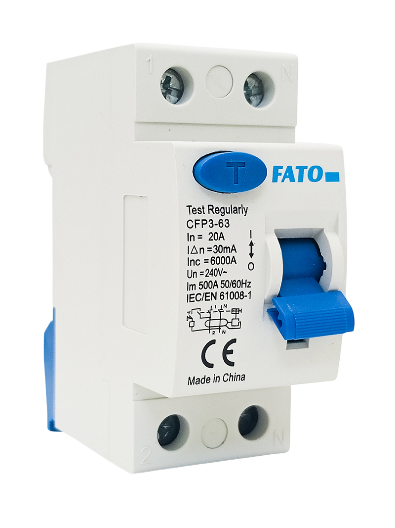 Interruttore magnetotermico differenziale bipolare (salvavita) della serie FATO CFP3-63, ideale per la protezione delle persone contro le correnti di dispersione a terra. Dotato di pulsante di test per un controllo periodico del corretto funzionamento.