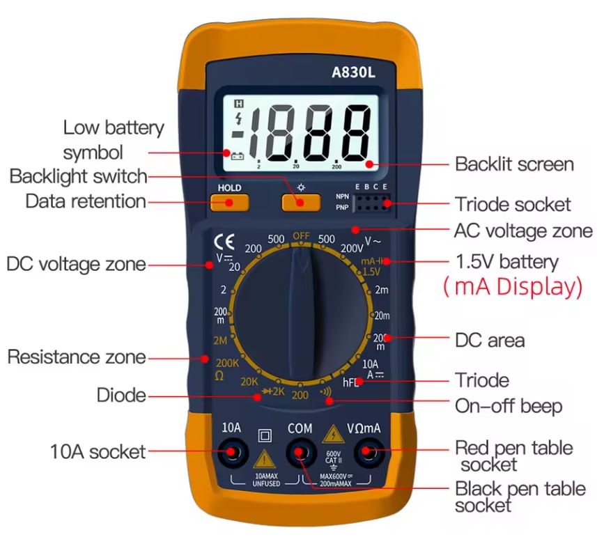 Strumento di misura digitale compatto e preciso, ideale per l’uso domestico, hobbistico e professionale. Il multimetro ANENG A830L consente il monitoraggio accurato di vari parametri elettrici.