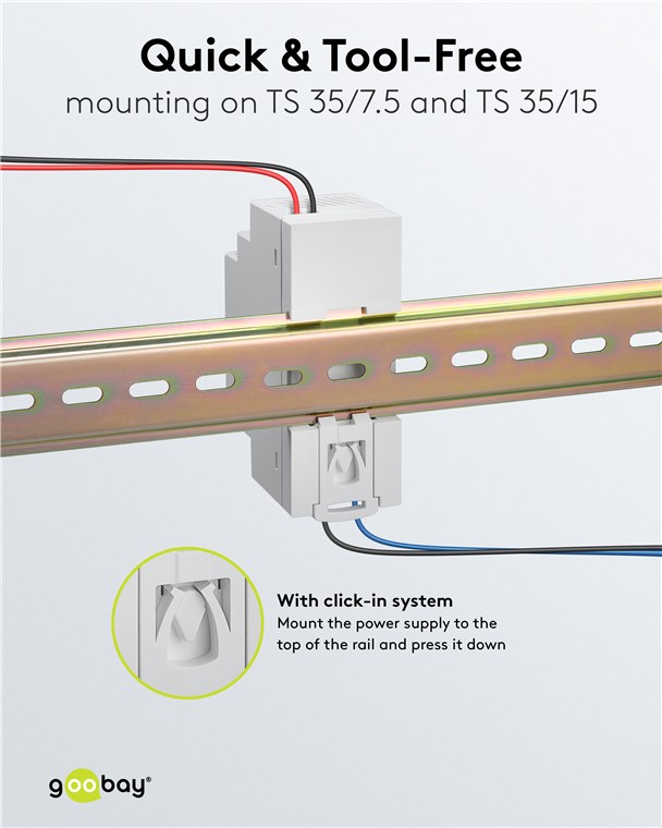 - Particolarmente compatto, con una larghezza di 35,2 mm, può essere montato in modo semplice e rapido su una guida DIN con profilo a cappello con un sistema a scatto, ad es. in un armadio elettrico