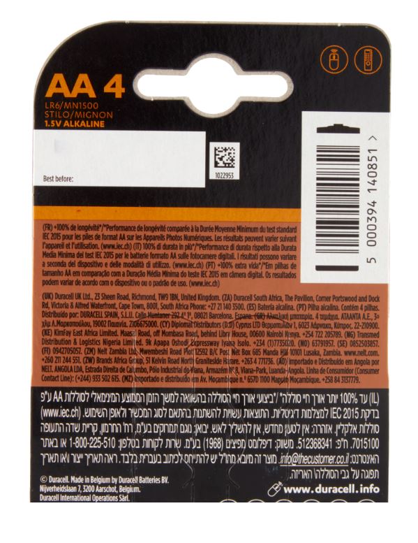 Batteria stilo alcalina 1.5V AA Duracell - confezione da 4 pezzi