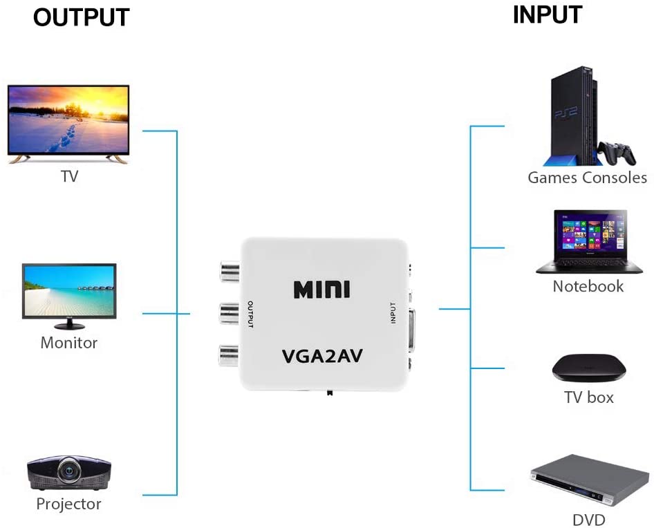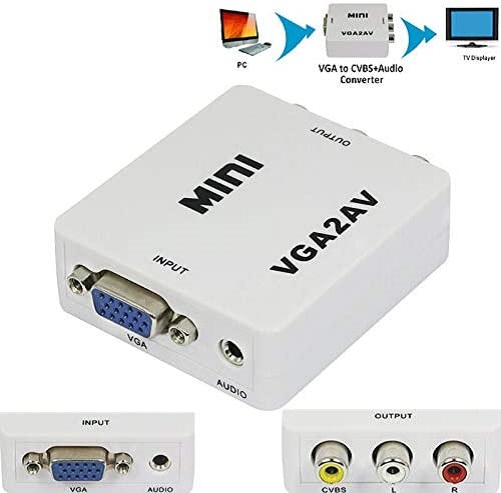 Questo convertitore audio VGA a AV è progettato per convertire una vasta gamma di immagini del computer, da 640 x 480 a 1920 x 1080, a video NTSC o PAL interlacciati.