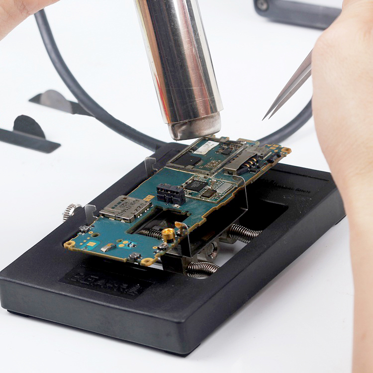 La sua base è stata progettata con un materiale plastico antistatico, dotata di piedini in gomma e un meccanismo di morsetti regolabili con un sistema di scorrimento che permette di bloccare il componente in base alla sua dimensione.