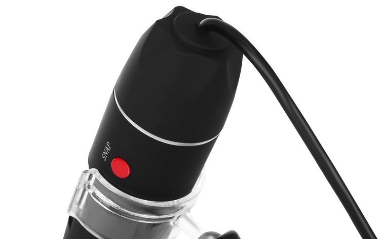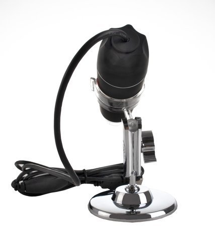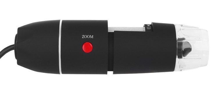 Il microscopio è compatto e puoi portarlo con te sul campo con il tuo laptop. Può essere posizionato su un apposito supporto con ventosa, che consente un posizionamento stabile del microscopio, oppure può essere tenuto in mano. Il treppiede ha una testa rotante a 360 gradi. Lo zoom è possibile ruotando la manopola sul microscopio.