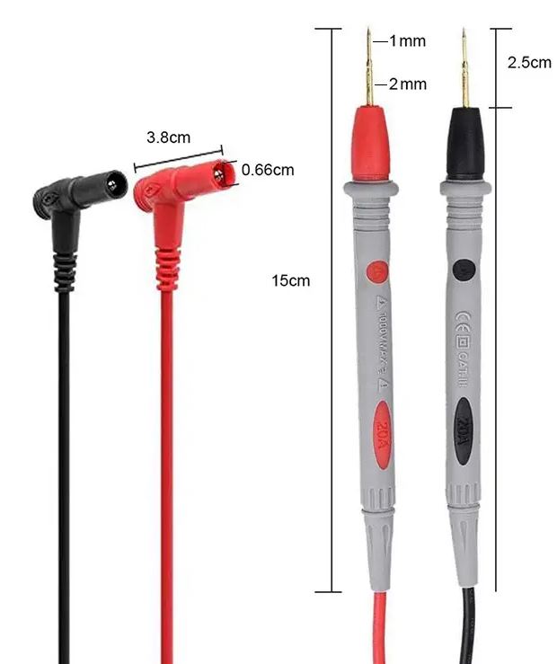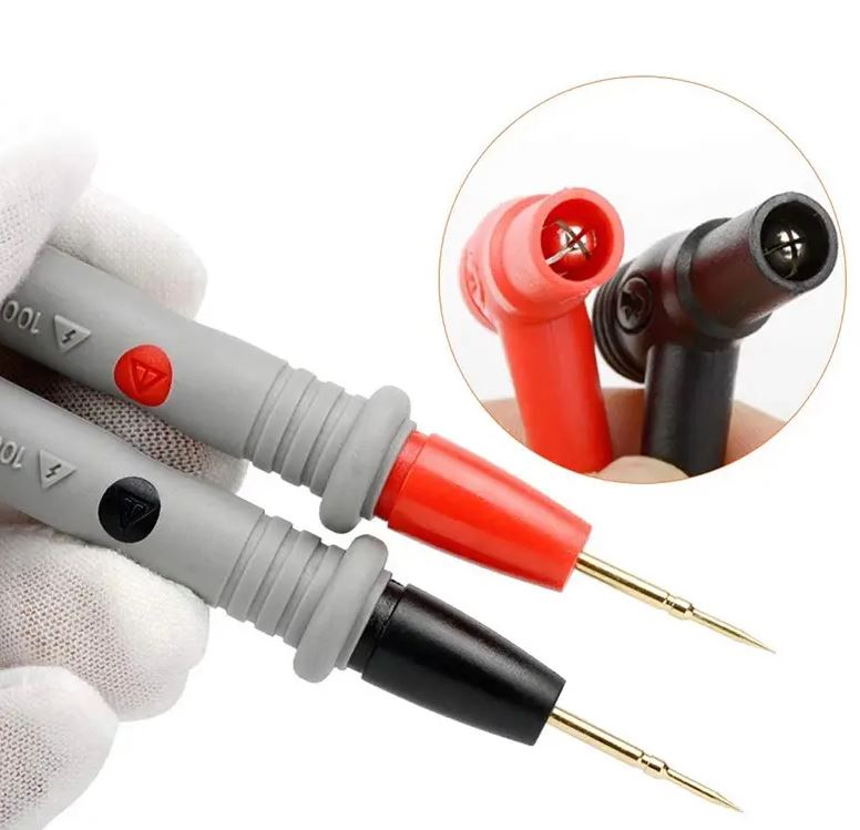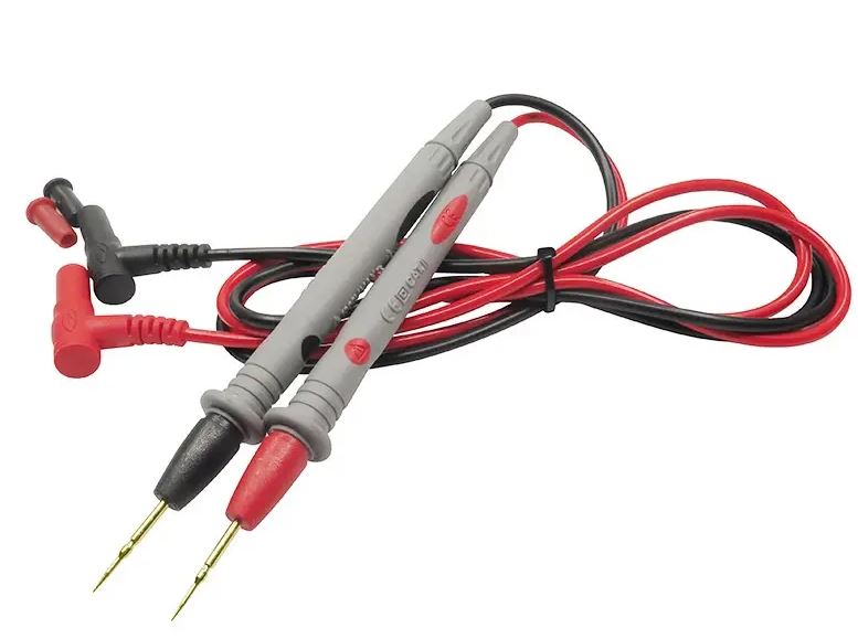 Puntali per multimetro con punte a spillo dorate, spina a banana da 4 mm, CAT III 1.000V 20A e cappucci protettivi, filo in silicone con punta ad ago.