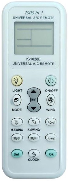 Telecomando universale modello K-1028E, ideale per condizionatori e climatizzatori. Dotato di ampio display LCD dispone di tutte le più importanti funzioni quali accensione / spegnimento, timer, regolazione potenza, ventilazione, alette e altro.