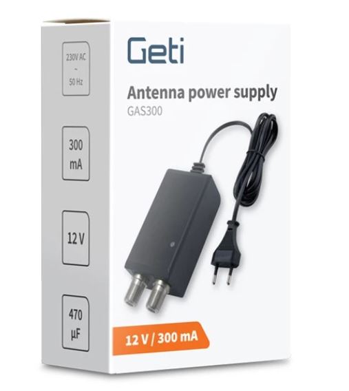 L'alimentatore per antenna GETI GAS300 è progettato per alimentare preamplificatori per antenna, amplificatori e hub attivi in piccoli sistemi di antenna che richiedono una tensione di 12 V CC. È dotato di prese per il collegamento di connettori F, il che rende l'assemblaggio del cavo coassiale molto più semplice e veloce. La luce LED indica la presenza della tensione di uscita e il corretto funzionamento dell'alimentatore.